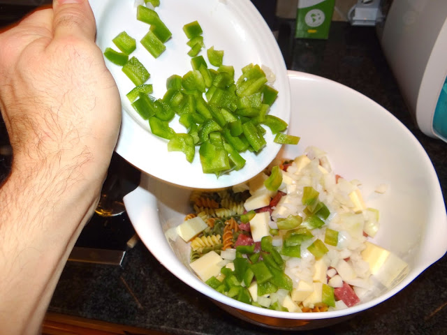 2. In a bowl combine cheese, pasta, salami, pepper, onion, and tomatoes.