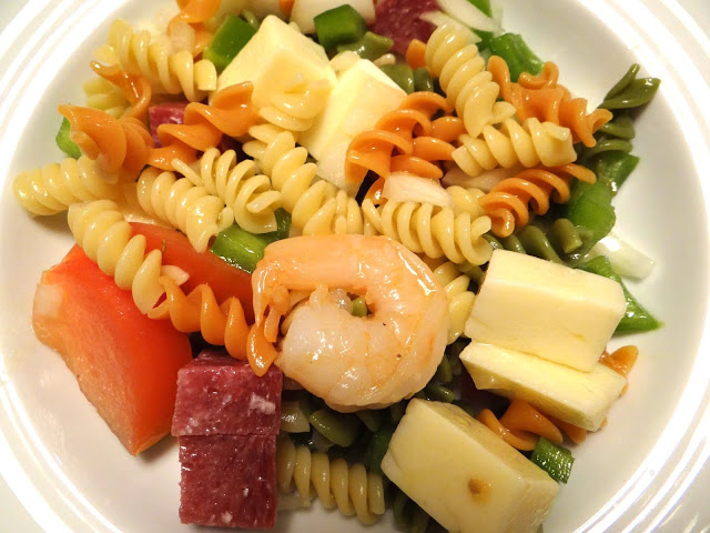 Ingredients: -4 cups uncooked tricolor pasta -1/2 pound baby shrimp cooked -3 ounces provolone cheese – 4 ounces hard salami -1 small green pepper -1/2 cup chopped tomato -1/2 onion -1/2 cup olive oil -1/2 cup cider vinegar – pinch of salt/pepper