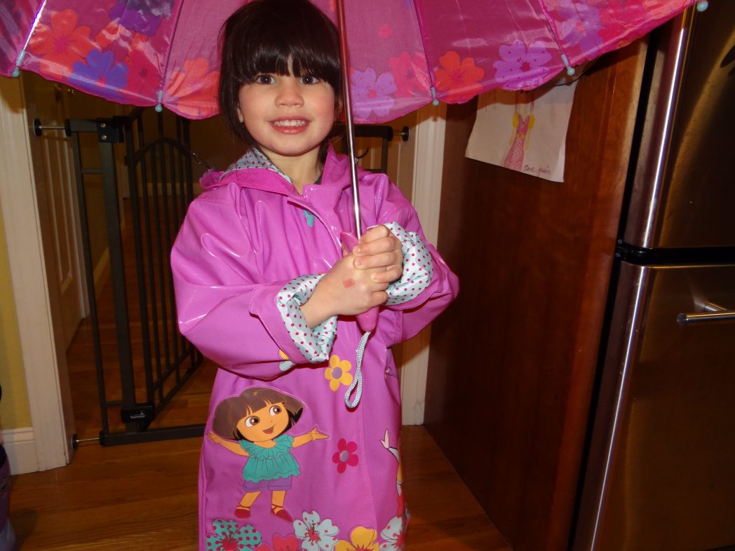 Let me just tell you all, that a few weeks ago Hayley received a Kidorable Rain Coat, Boots, and Umbrella all in a matching Dora the Explorer theme. Hayley since the time she received them, has not worn any other coat and boots. She is just too cute and goes around the house asking if she could pretend it is raining so she could wear all her gear! I have to admit, the line is incredibly cute and I have no problem with Hayley wearing her gear 24/7.