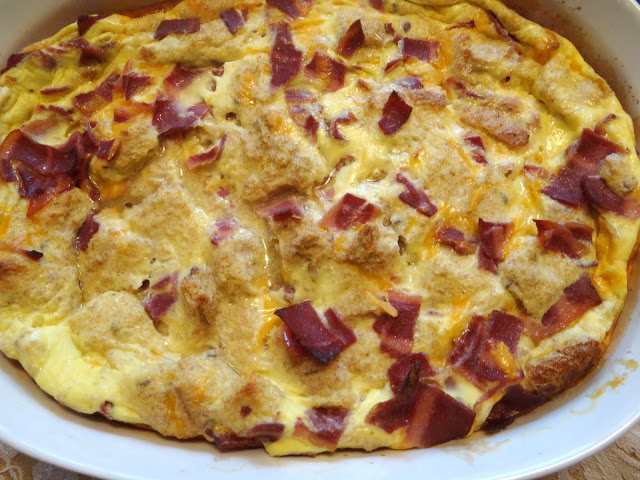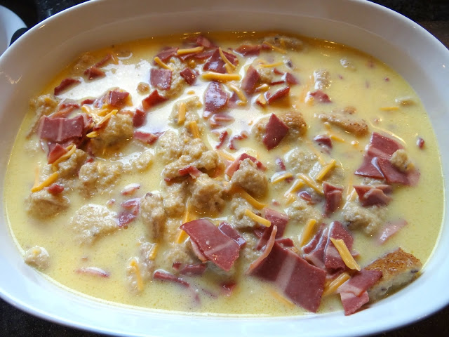 3. Preheat the oven to 350 degrees. Cut 12 slices of bread into 1 inch square cubes, remembering to cut off the crusts. Then add the bread cubes, turkey bacon pieces, cheddar cheese into the milk mixture (see #2) and stir with a whisk.