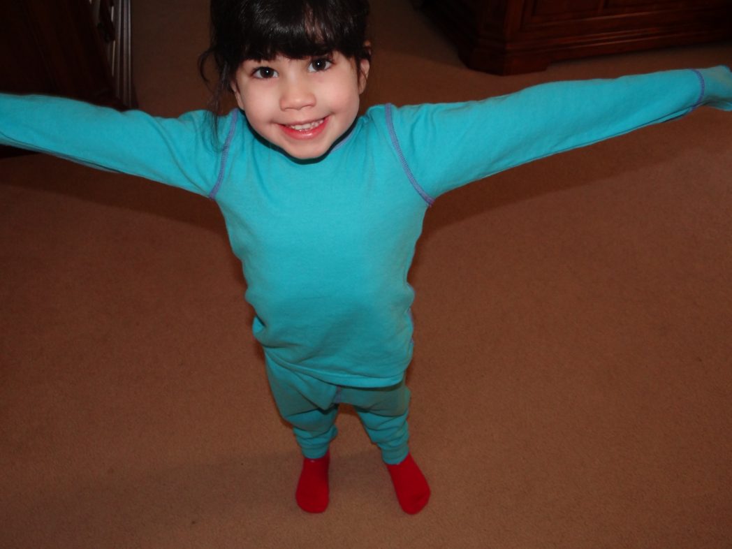 Hayley was sent the Double Layer Long Sleeve Top in blue with the Long John Double Layer pants. While we use the Double Layer collection under her ski clothes, you can dress your kids most days in these johnny and top set to keep them warm and comfortable. These garments possess two layers that are designed to trap body heat inside your child’s clothing. I know when Hayley wears her Watson’s Thermal Outfit she stays warm and comfy, even in the temperatures fall below zero.