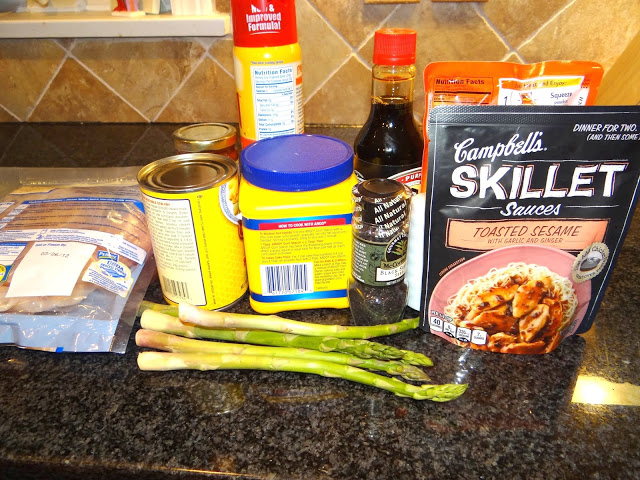 When I got home from Shaw’s, it was time to make the Sesame Chick Stir-Fry (recipe adapted from My Recipe). I gathered all my necessary ingredients for #dinnerin15 including: 1 tbs. black sesame seeds, 1/4 tsp. salt, 1 lb. chicken breast, cooking spray, one can of mushrooms, one can of corn, Campbell’s Toasted Sesame Skillet Sauce, 3 cups of asparagus, 1/2 cup of chicken broth, 2/3 cup soy sauce, 1 tsp. cornstarch, and 2 cups of brown rice.