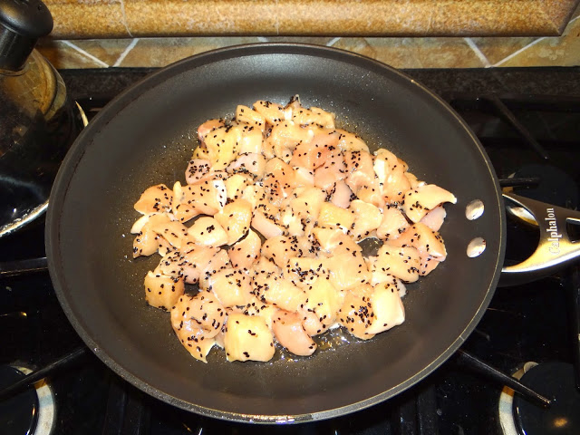 2. Combine 1/4 tsp. salt and 1 tbs. black sesame seeds in a large bowl. Add cooked chicken cubes and toss with the seed mixture. Remove chicken and put coated chicken aside.