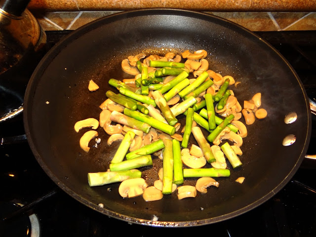 3. In the pan, coat with cooking spray and add 1 can mushrooms, 1 can corn, and 3 cups of asparagus on medium heat. Set aside.