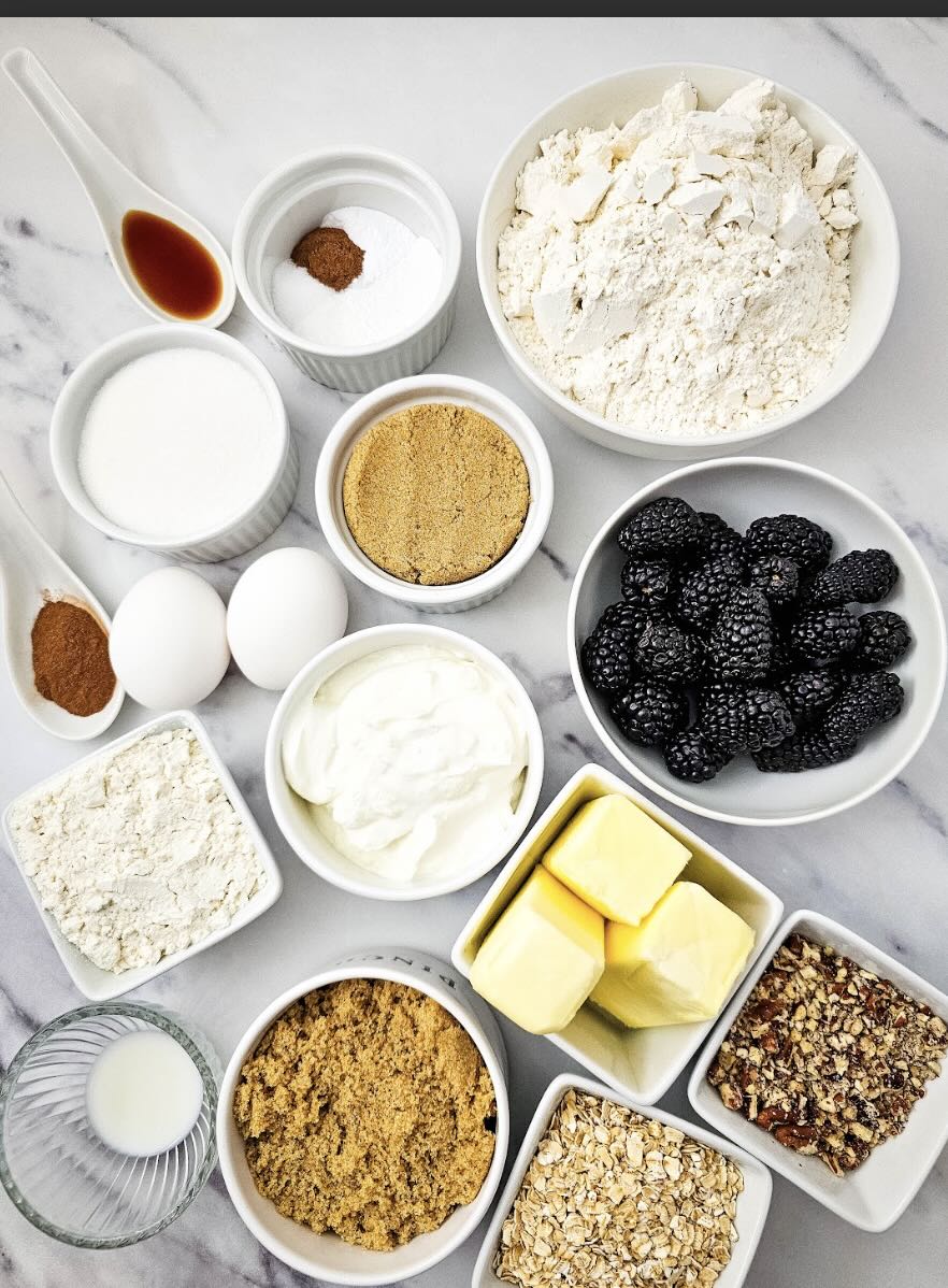 Flour, baking powder, baking soda, salt, cinnamon, eggs, sour cream, milk, sugar, brown sugar, butter, vanilla, blackberries, pecans, flour, oatmeal