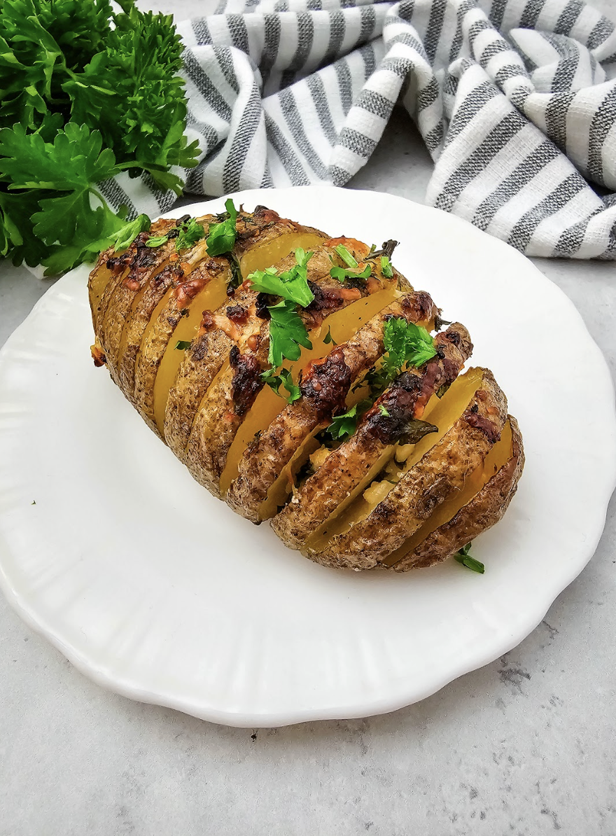 - Mix the melted butter, parmesan, chopped parsley, and garlic together, then brush over the potatoes, allowing some to seep between the cuts you made.Bake for 15-20 minutes more.